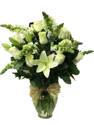 Hermoso arreglo floral blanco que contiene lilium y rosas en un delicado florero de vidrio. Ideal para regalar a esa persona que tanto quieres.