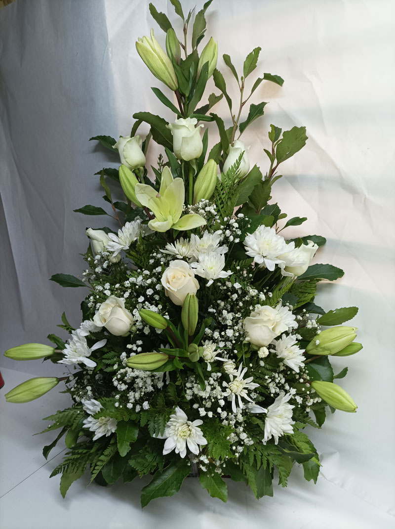 Arreglo en base de madera con lilium, mables , rosas, gypsophila y follajes.