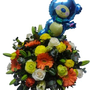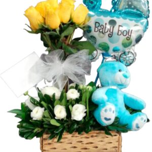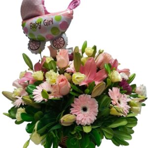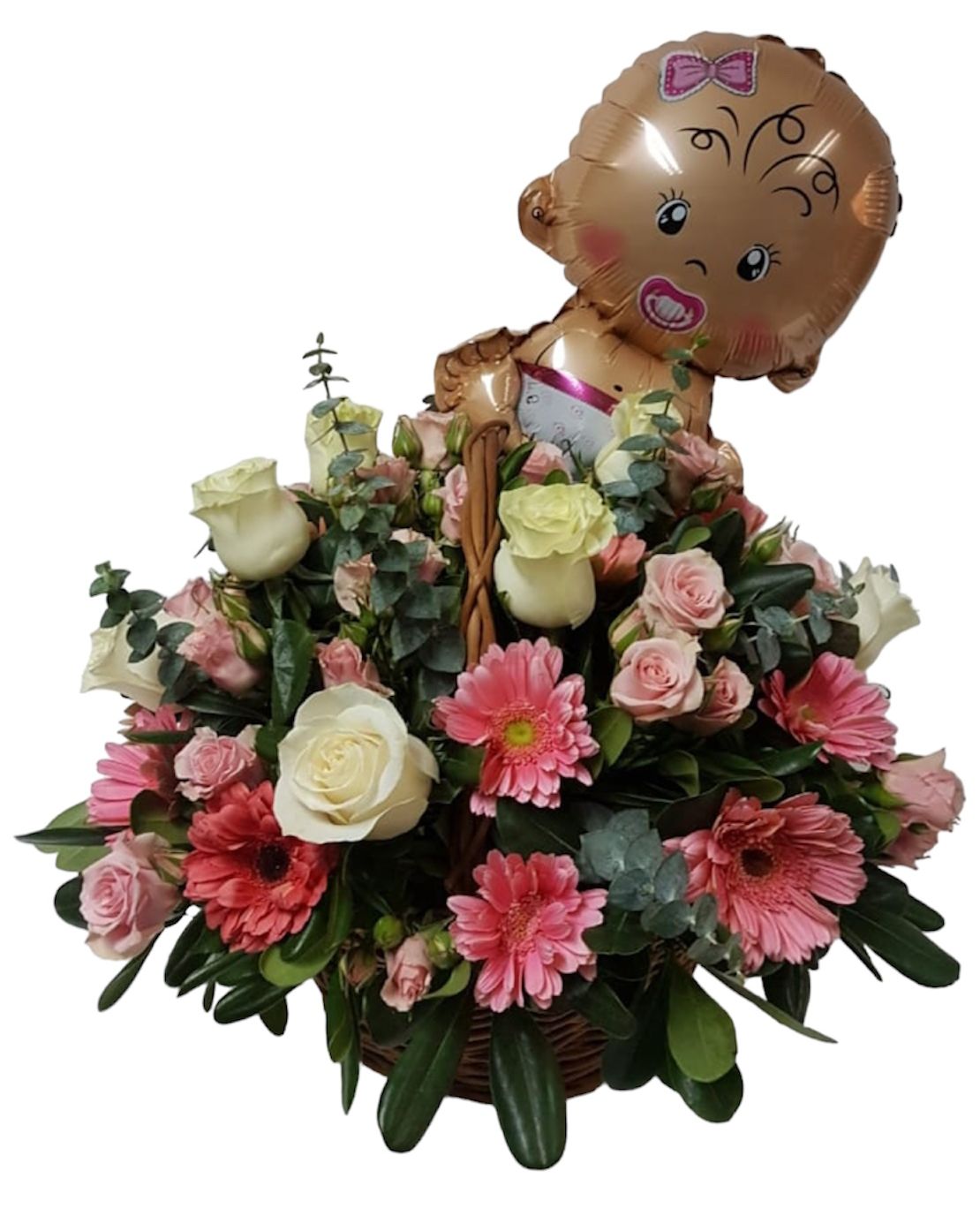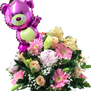 Canasto de mimbre con rosas, gerberas y mini rosas en tonos rosados. Incluye globo.