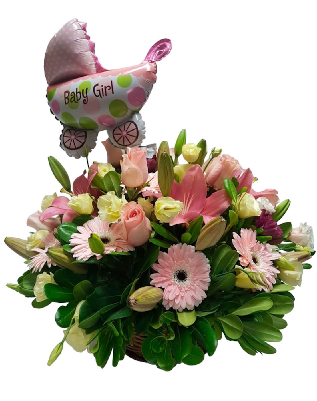 Canasto de mimbre con lilium, gerberas, rosas y follajes en tonos rosados. Incluye Globo.