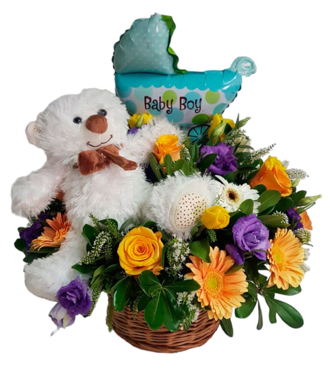 Canasto de mimbre con rosas, lisianthus, gerberas y follajes. Incluye Peluche y globo. Arreglo disponible en tonos para niña o niño.