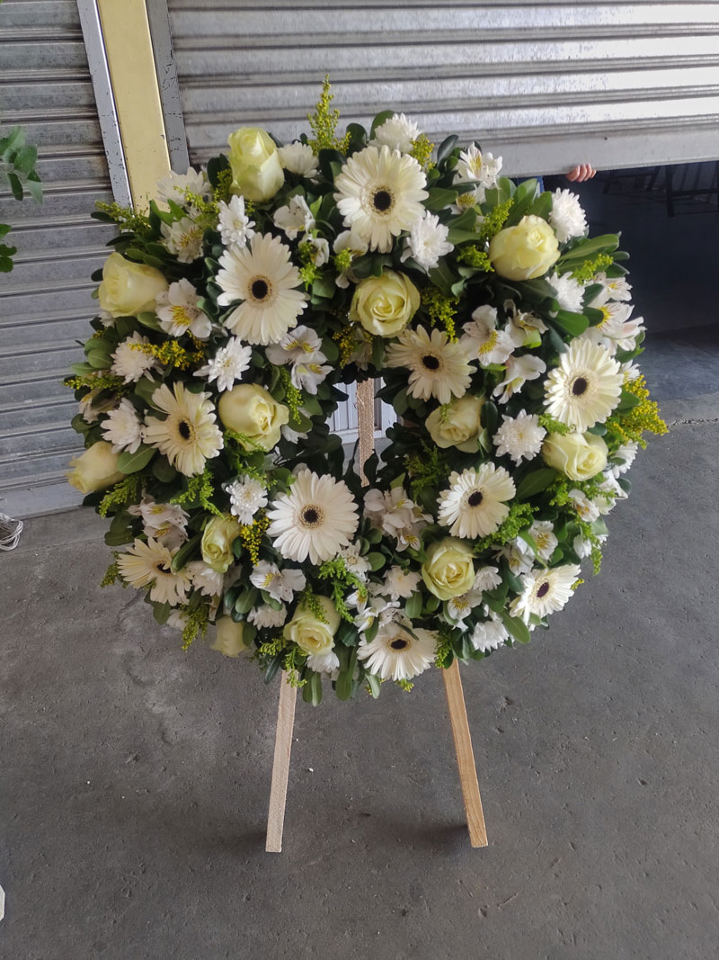 Corona blanca con gerberas, rosas, mables y follajes. Incluye atril.