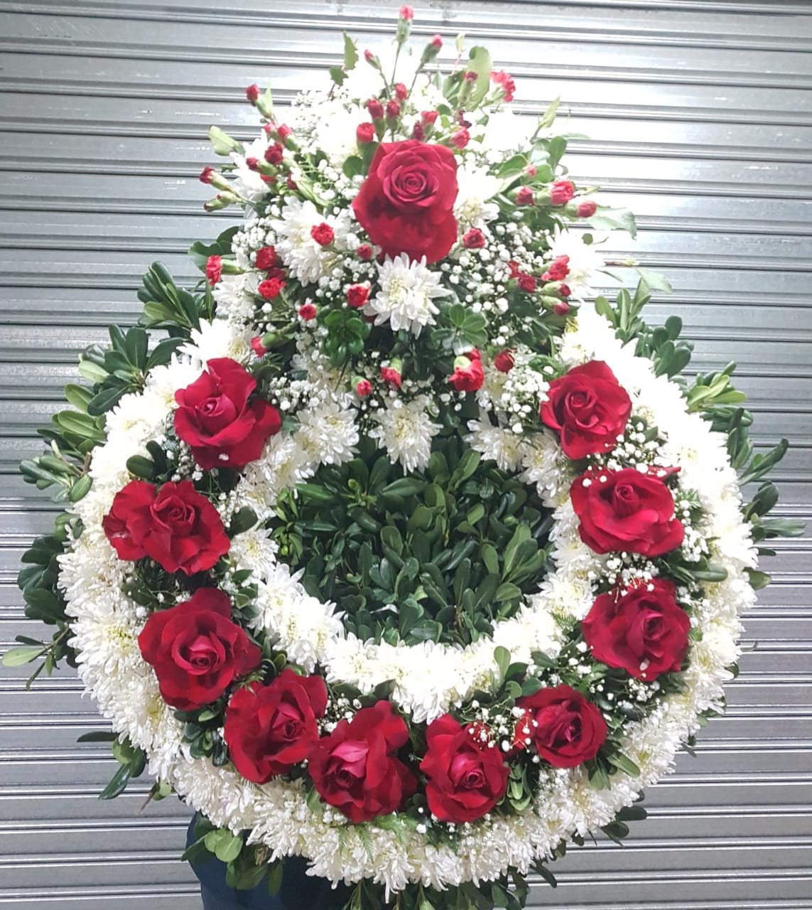 Corona con rosas rojas y claveles, Incluye atril.