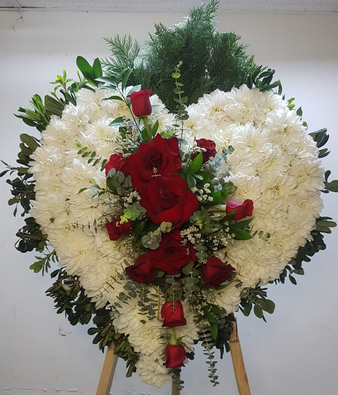 Corazón con rosas rojas, gypsophila y follajes en el moño. Incluye atril.