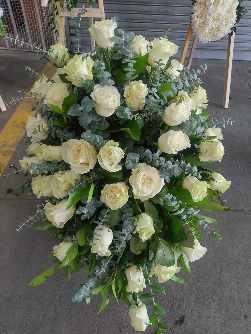 Arreglo en base especial para ser colocado sobre ataúd. Contiene 50 rosas blancas, eucaliptus y follajes.