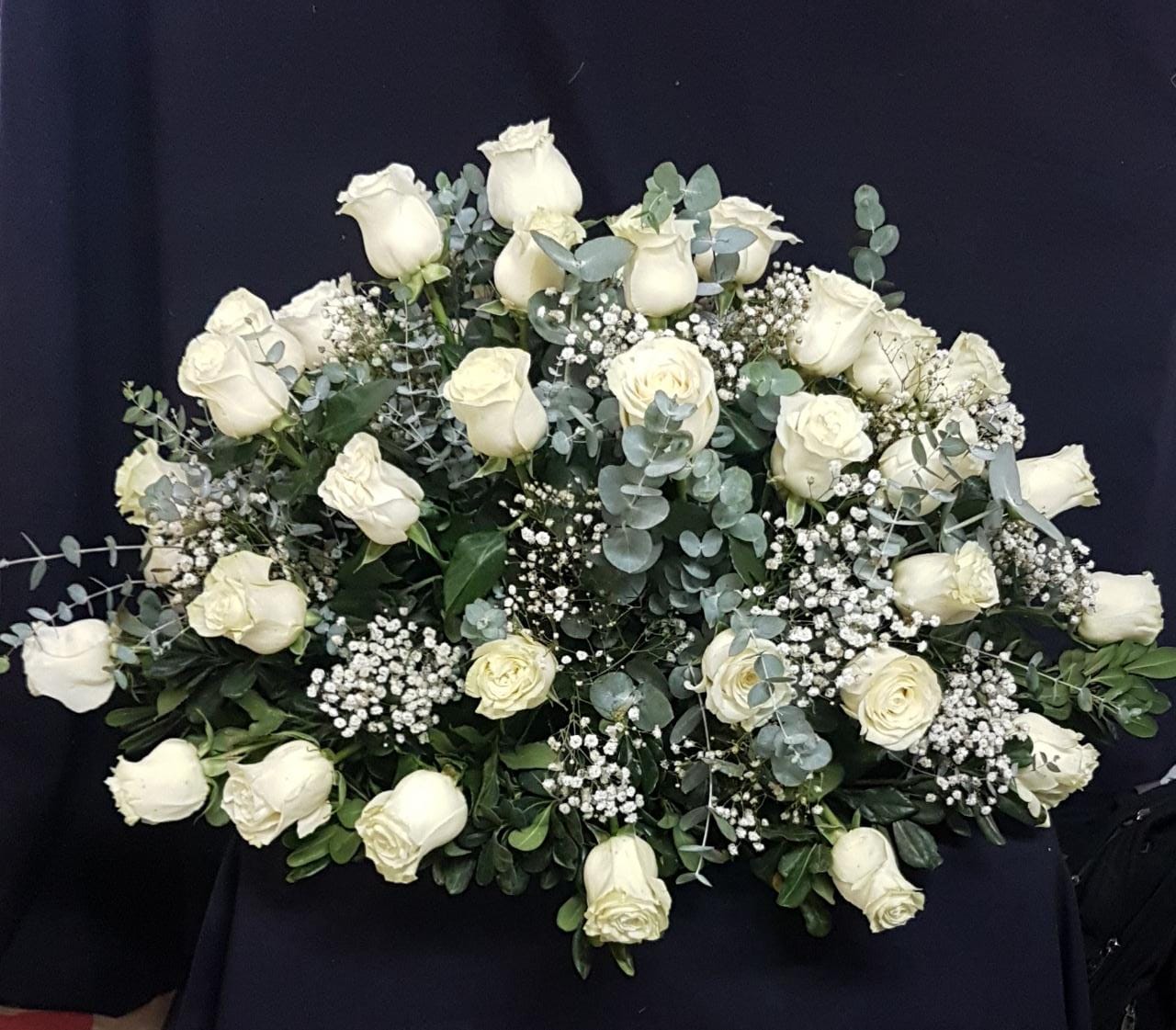 Arreglo en base especial para colocar sobre ataud, contiene 50 rosas blancas, eucaliptus, gypsophila y follajes.