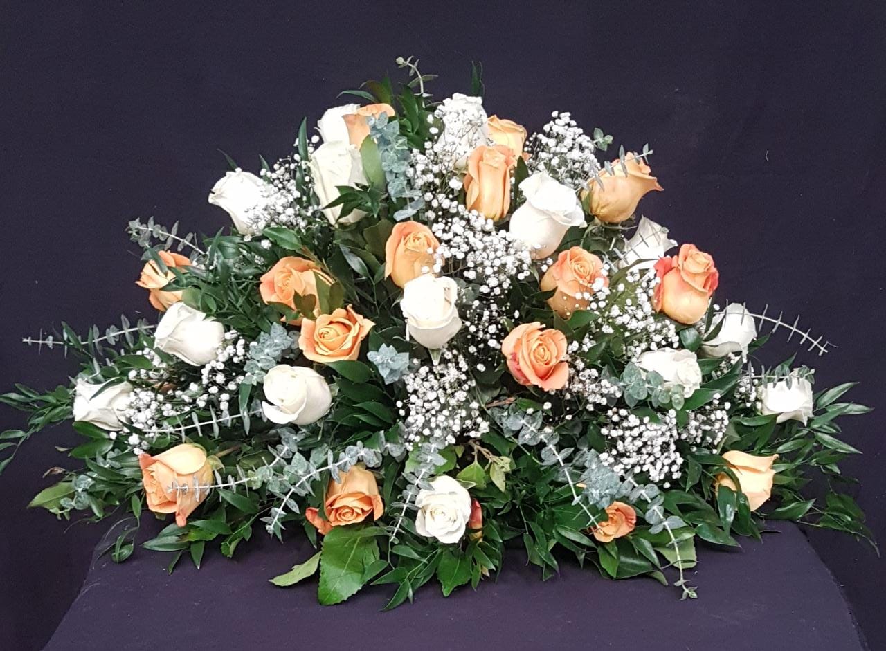 Arreglo en base especial para colocar sobre ataúd, contiene 50 rosas mix, eucaliptus y follajes.