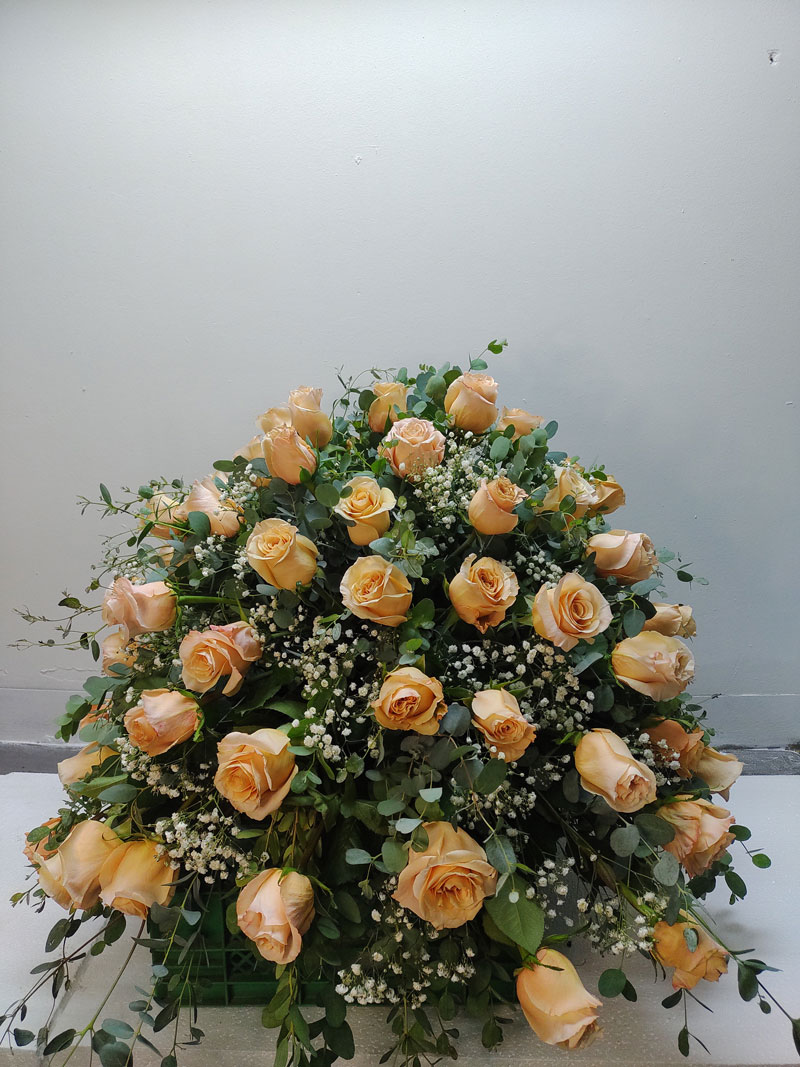 Arreglo en base especial para colocar sobre ataúd, contiene 75 varas de rosas, eucaliptus y follajes.