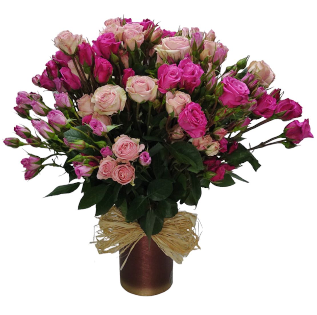Este florero contiene 30 varas de mini rosas colores mixto, follajes y moño de rafia.