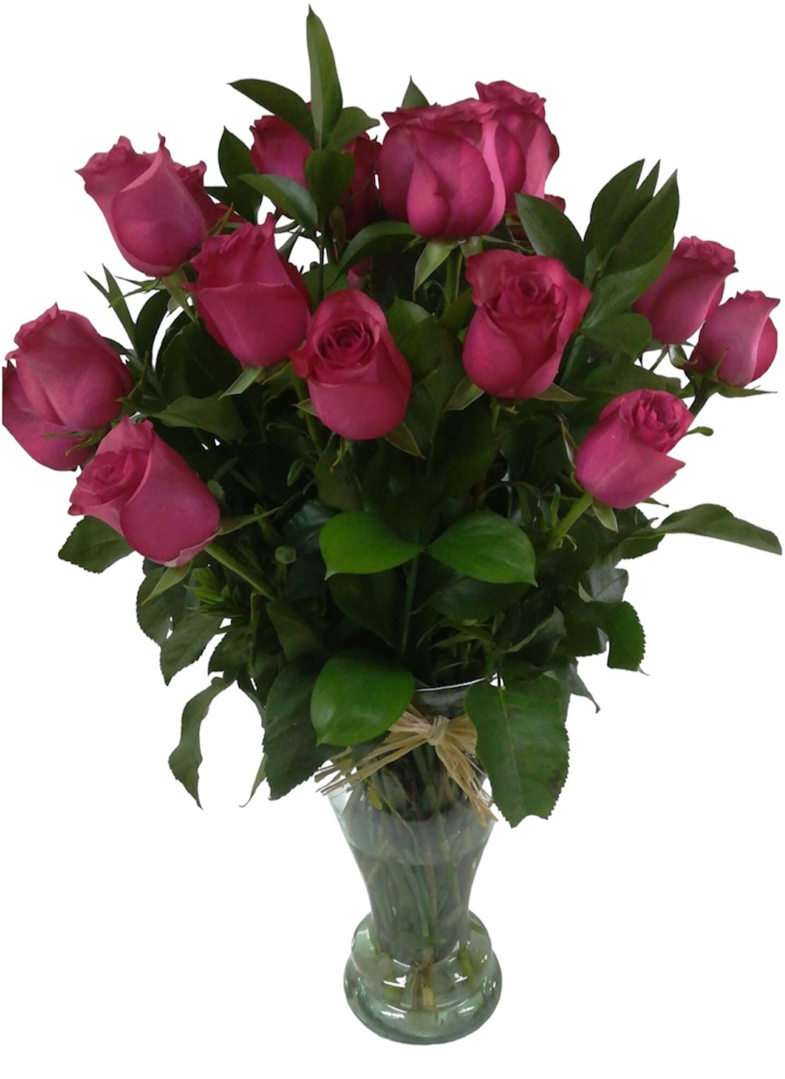 Florero con 24 rosas fucsias o rosadas, follajes y moño de rafia.