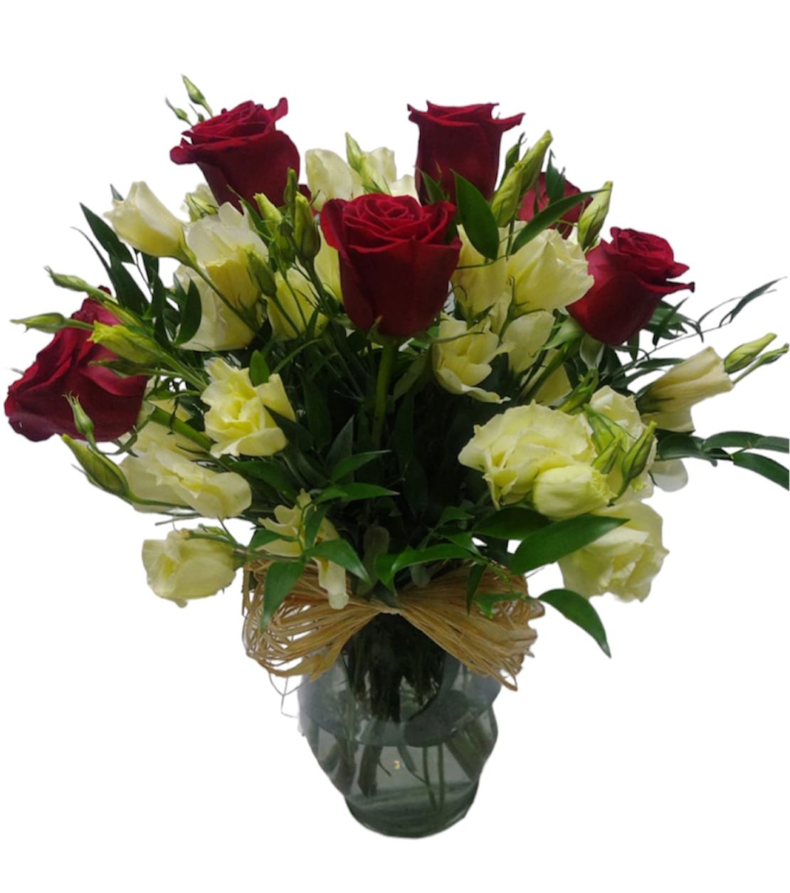 Florero con 6 varas de rosas rojas y 10 varas de lisianthus blancos o crema, follajes y moño de rafia.