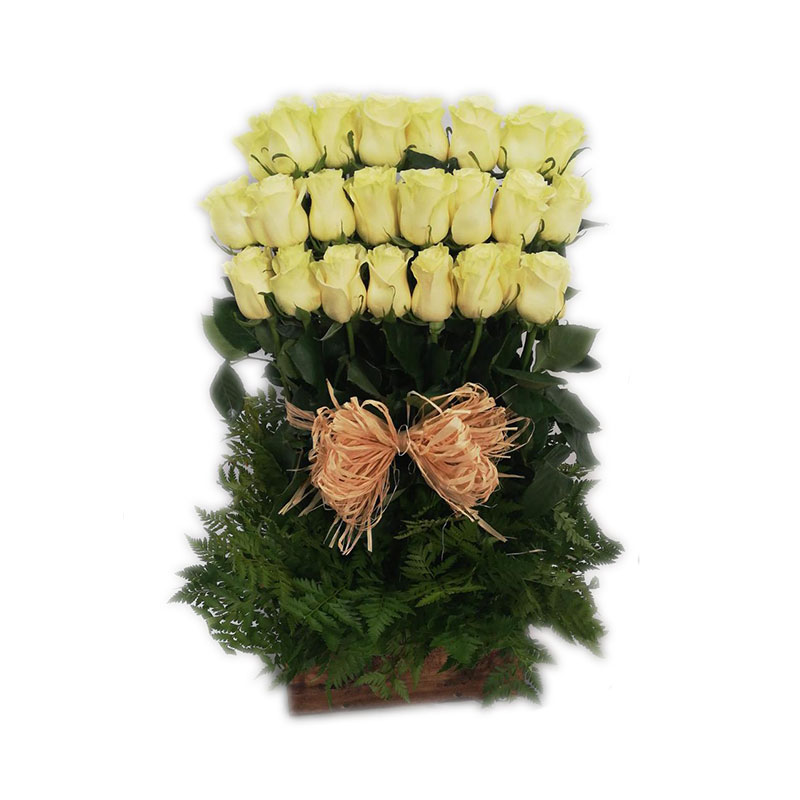 Arreglo en base de madera con 24 rosas, acompañado de delicados follajes y moño de rafia. Disponible en tonos blanco, rojo y rosado.