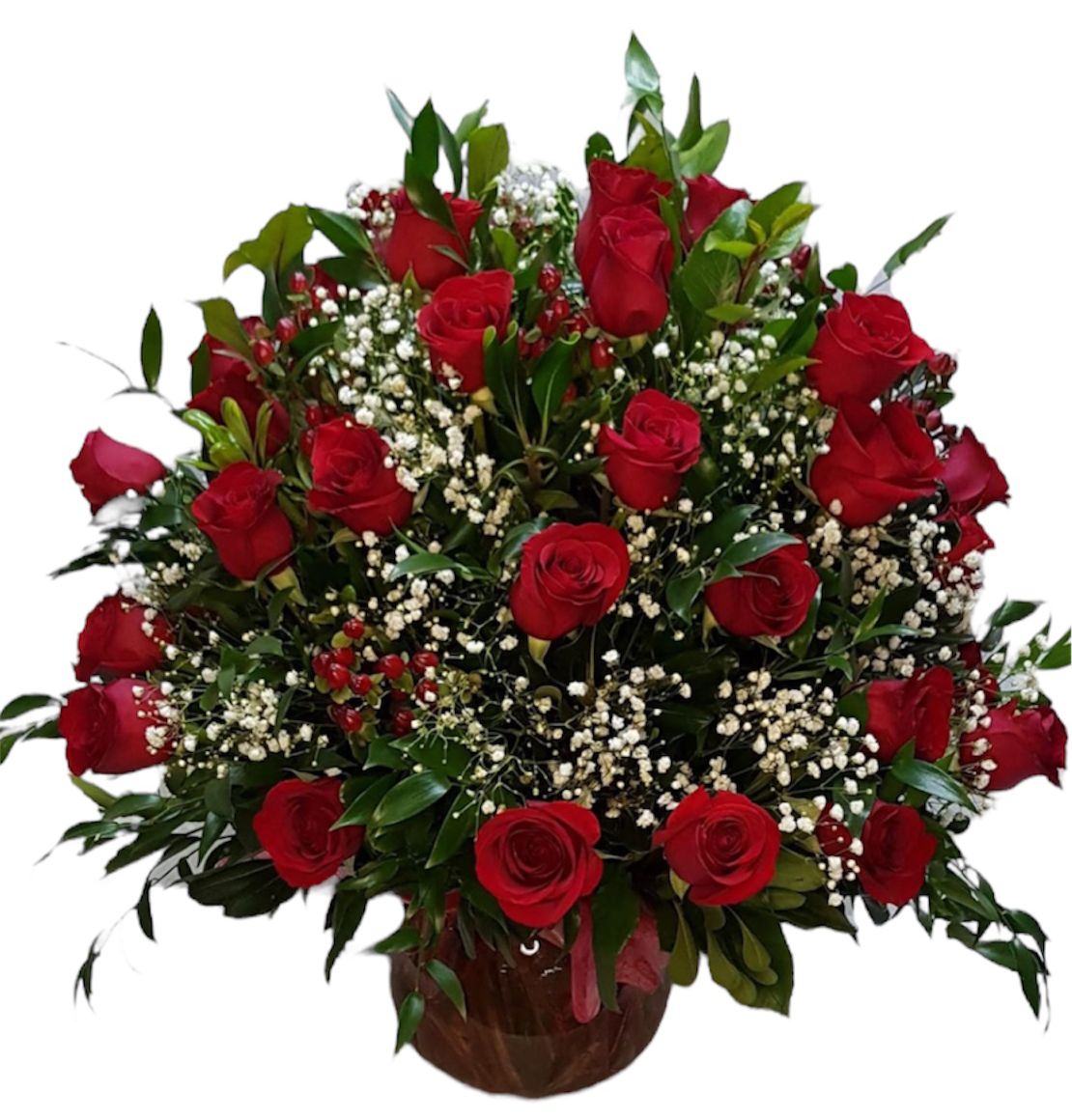 Pecera con 30 varas de rosas, 10 varas de hypericum, gypsophila y follajes.