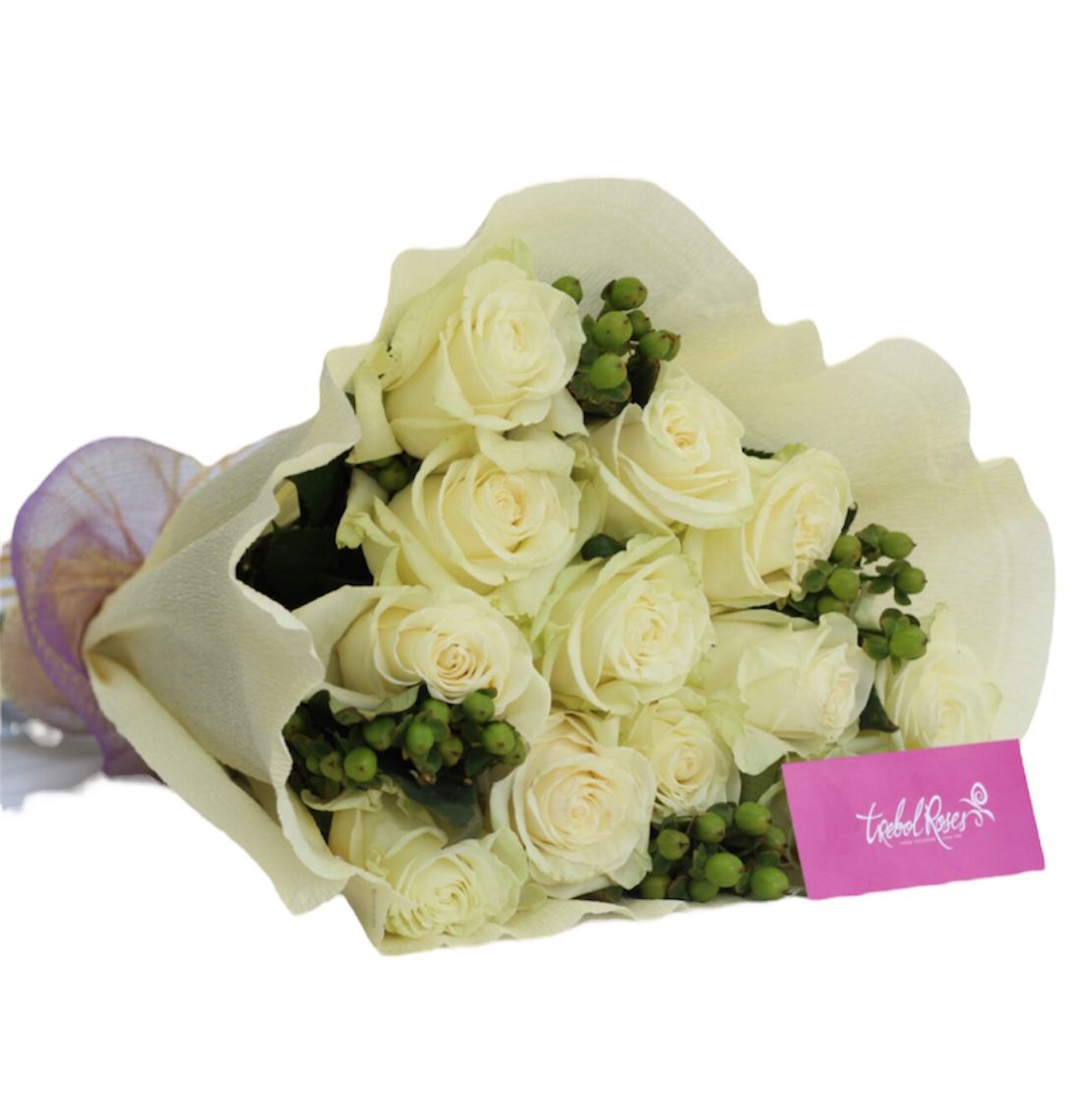 Hermoso ramo de 12 rosas blancas e hypericum. Envuelto en delicados papeles y amarrado con moño de rafia.