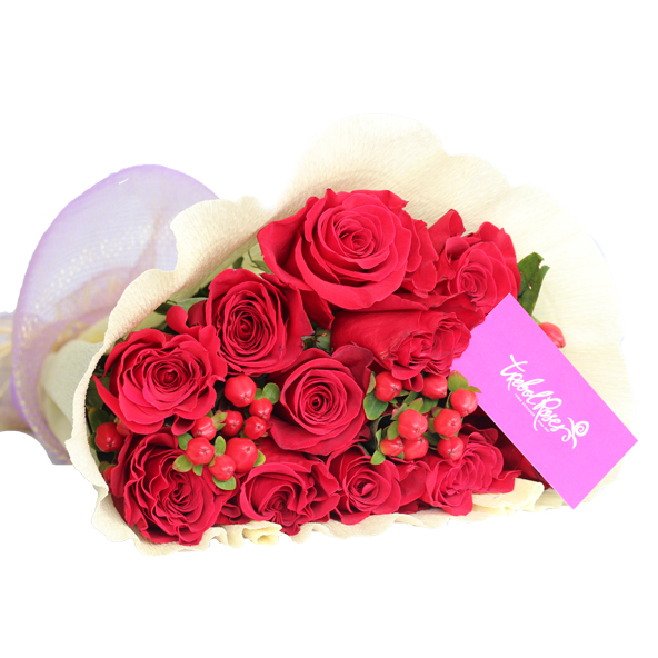 Hermoso ramo de 12 rosas rojas. Envuelto en delicados papeles y amarrado con moño de rafia.
