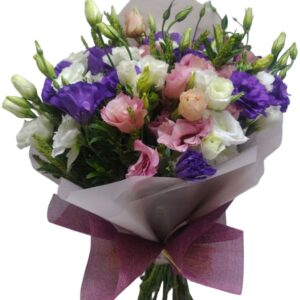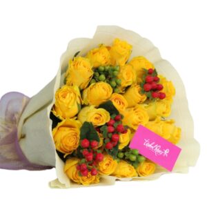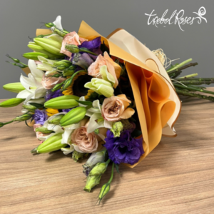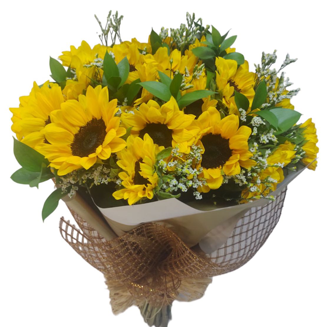 Ramo con 20 varas de girasoles, ruscos y gypsophila. Envuelto en delicados papeles y moño de rafia.
