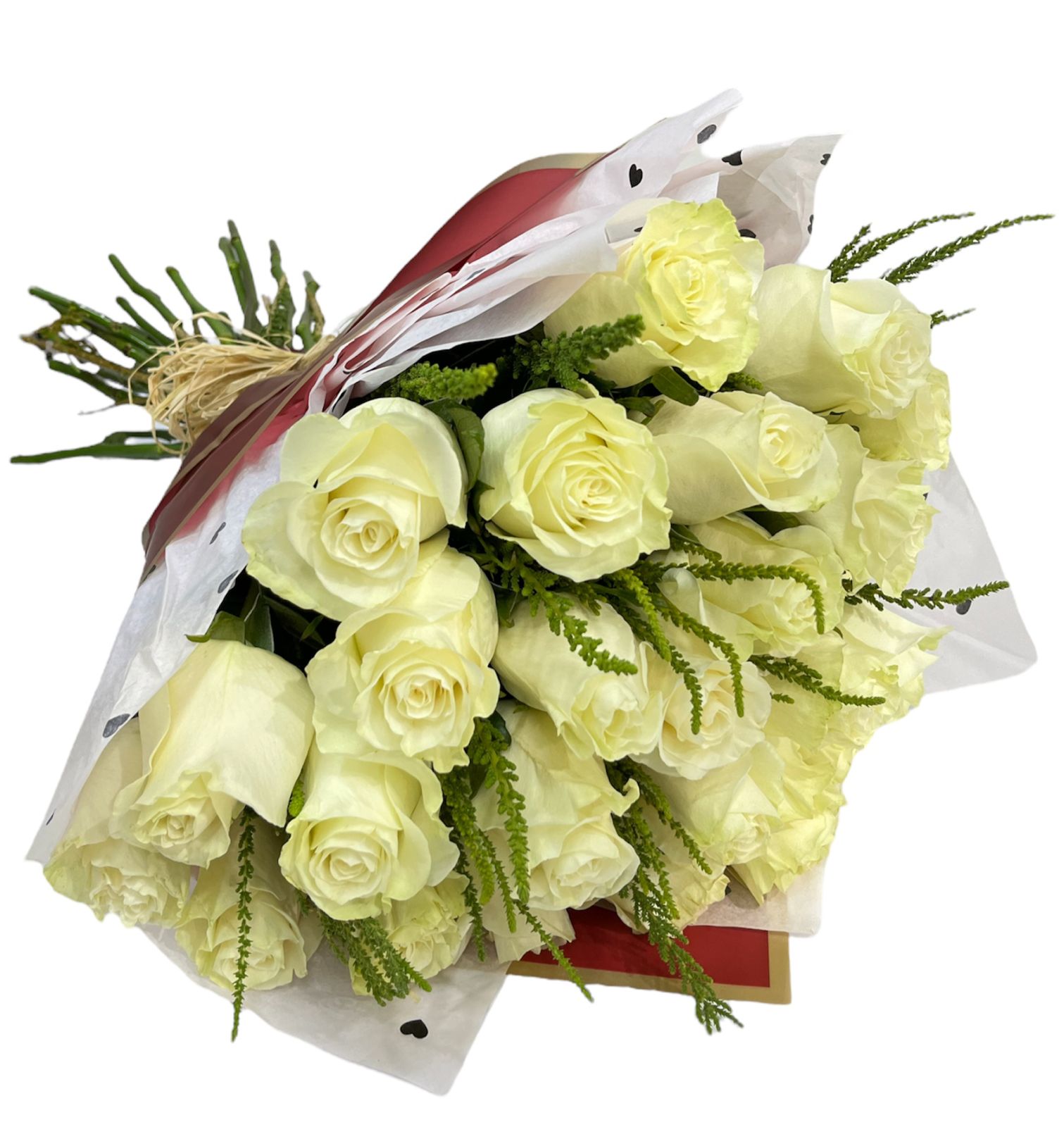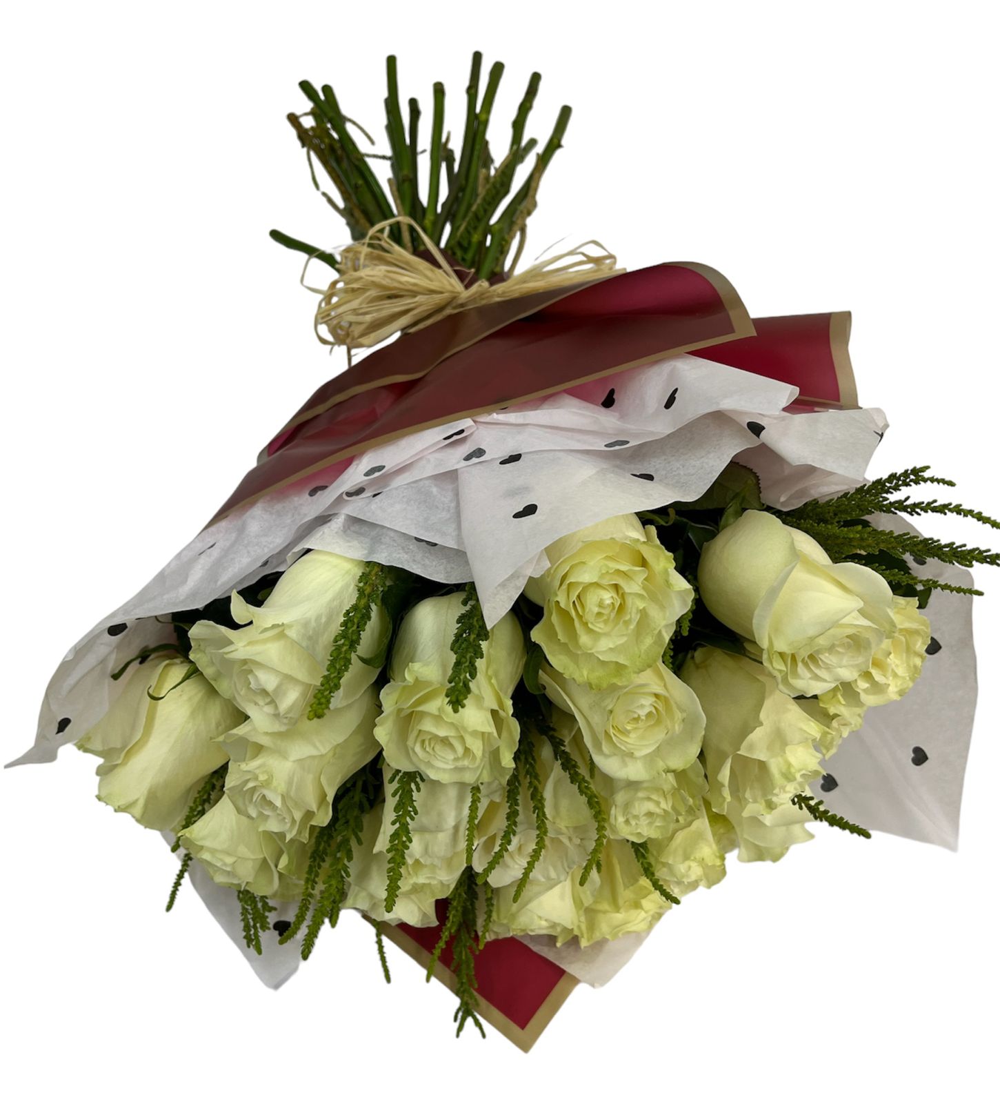 Ramo redondo con 24 varas de rosas blancas, y ruscus. Envuelto en delicados papeles y amarrado con moño de rafia.