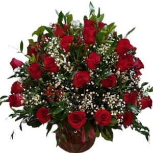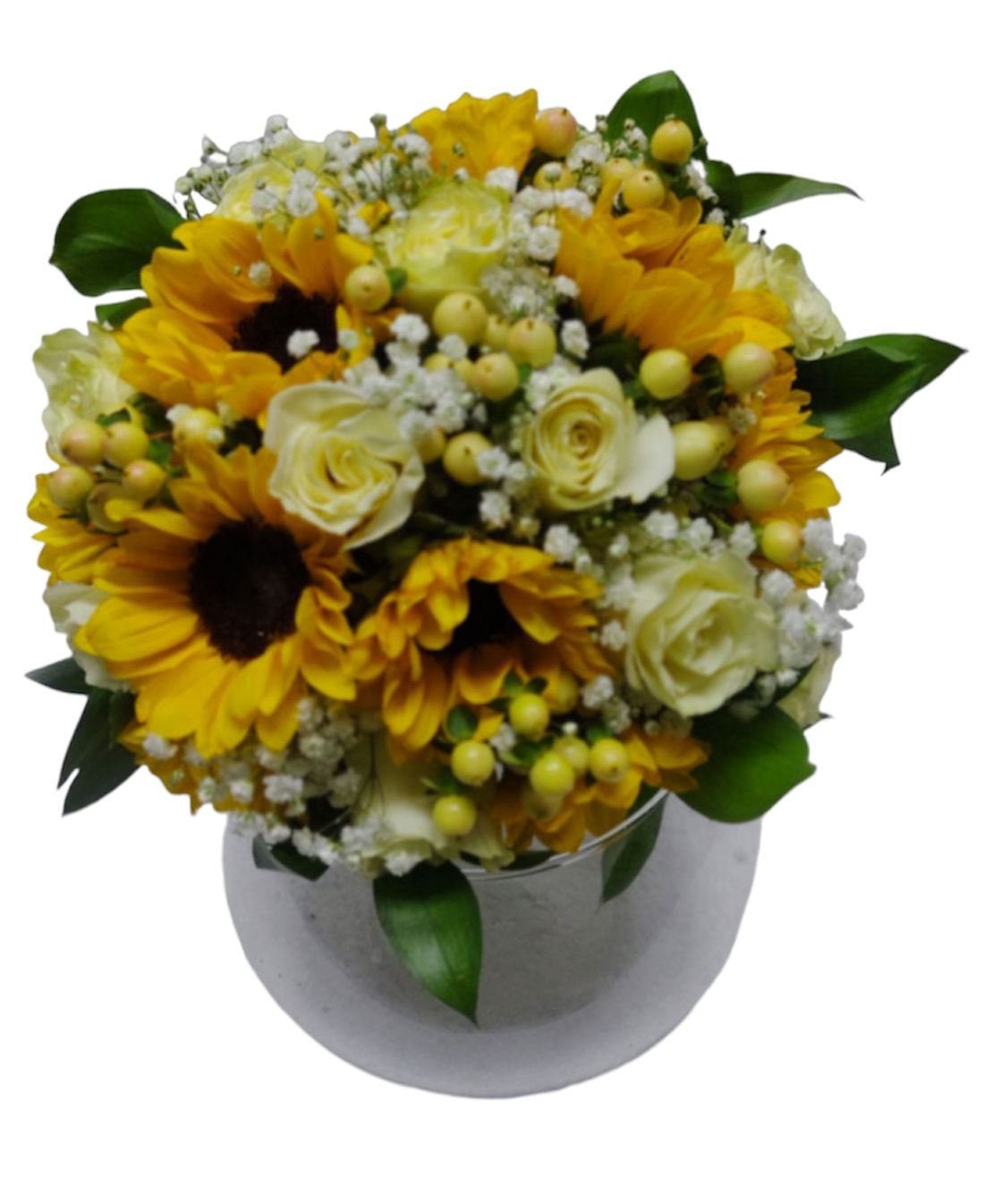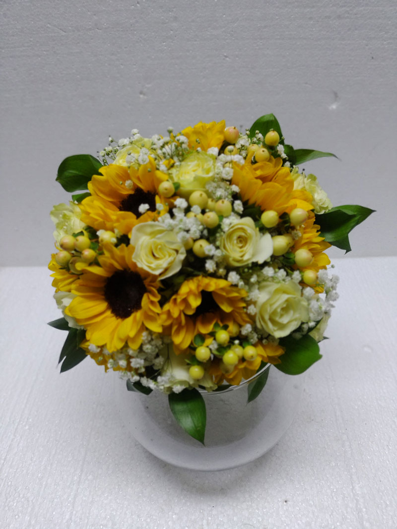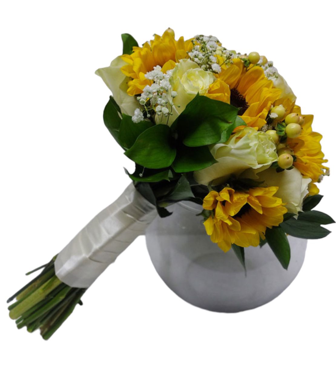 Ramo especial para novias contiene girasoles, rosas, hypericum, follaje y gypsophila. El embarrilado del ramo puede ser con cinta o rafia.