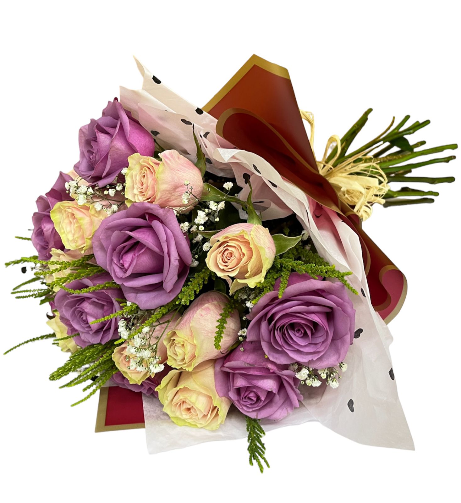 Ramo con 12 varas de rosas rosadas, 12 varas de rosas fucsias y ruscos. Envuelto en delicados papeles y moño de rafia.